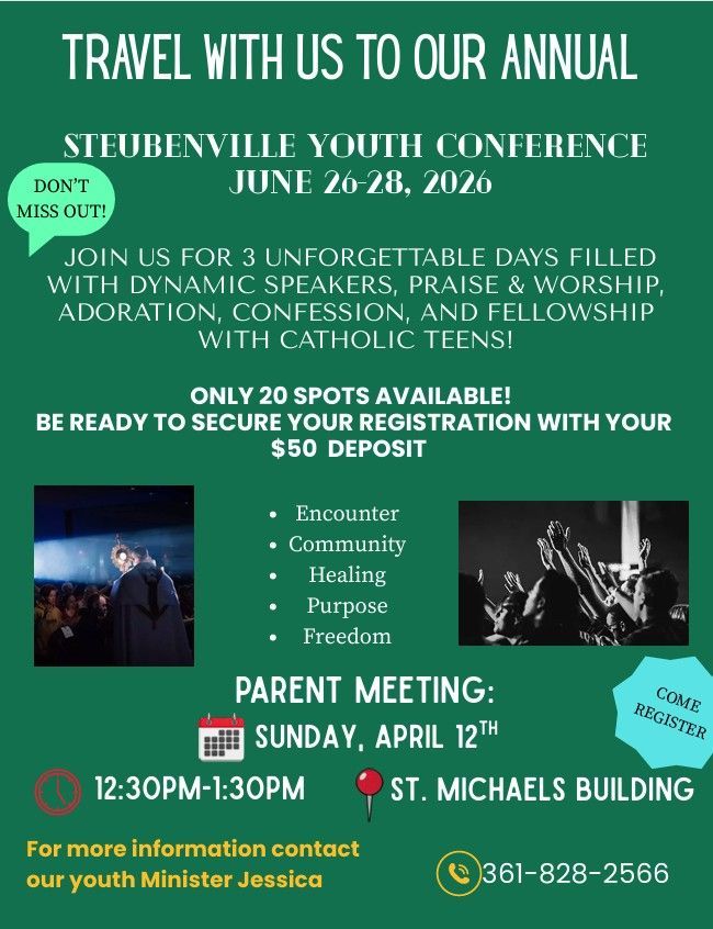 If you have any questions, please don’t hesitate to reach out to our Youth Minister, Jessica, at 📞 (361) 828-2566.