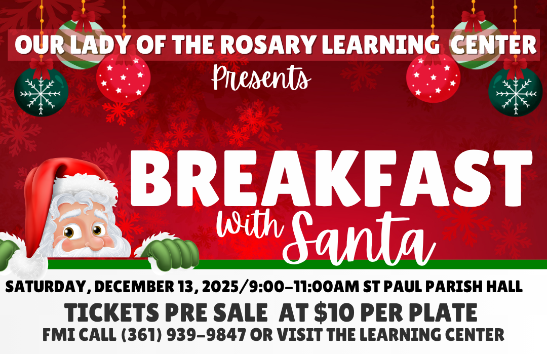 Our Lady of the Rosary Learning Center Annual Breakfast with Santa will be held on Saturday, December 13, 2025 at the Parish Hall.