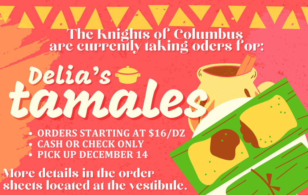 Knights of Columbus is preselling Delia's Tamales starting on November 22, after all masses. Last day to order is on December 9. Pick up on December 14 at the Parish Hall.